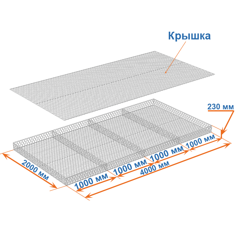 Габион матрац ГСИ-М 4х2х0,23 оцинкованный, Ø проволоки 3,0 мм, размер ячейки 8х10 см