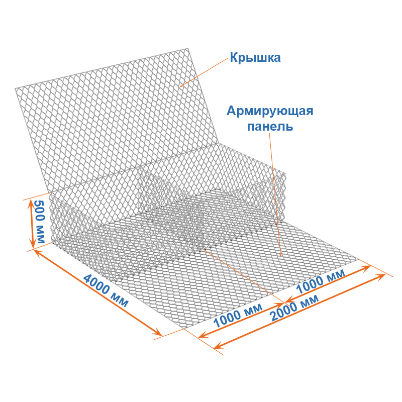 Габион с армирующей панелью 4x2x0,5 – это коробчатый габион, основание которого продлено и представляет собой армопанель.